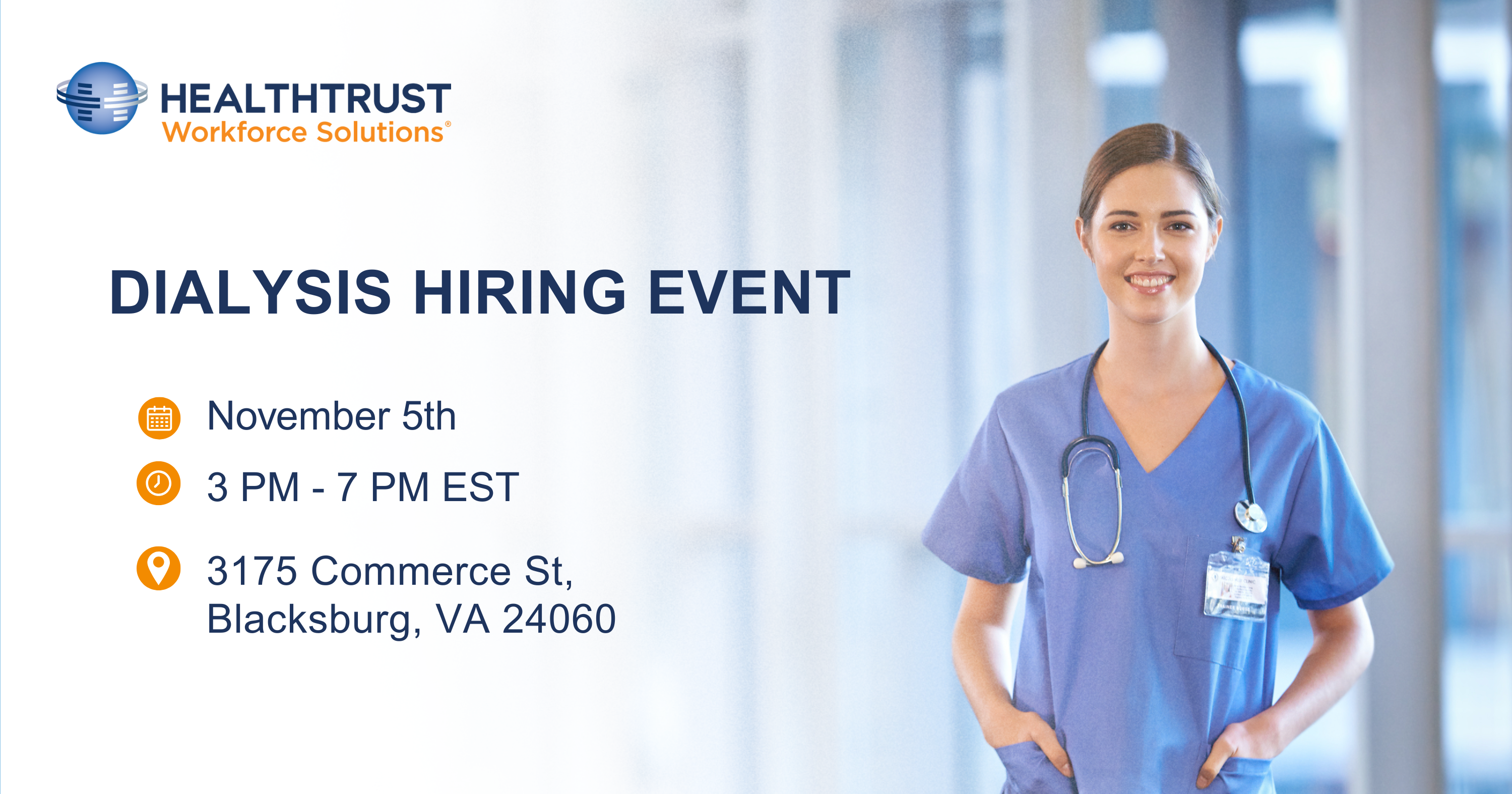 We're Hiring Dialysis RNs & Techs Near You! HealthTrust Dialysis Hiring Event in VA, Wed. 11/5
